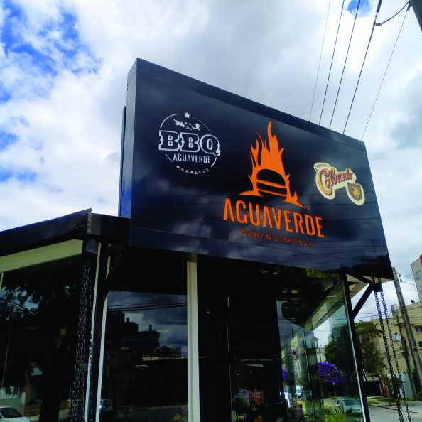 Comunicação Visual em Curitiba. Fachada produzida em ACM e estrutura em Ferro Galvanizado revestida em ACM preto, Corte vazado das logomarcas com frente em acrílico iluminação em led.