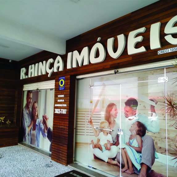 Letra Caixa em Curitiba, fachada feita com fundo deck de madeira e sinalização letra caixa alta. Porta de vidro e janelas com nossos Adesivos Perfurados, Impressão Digital alta resolução.