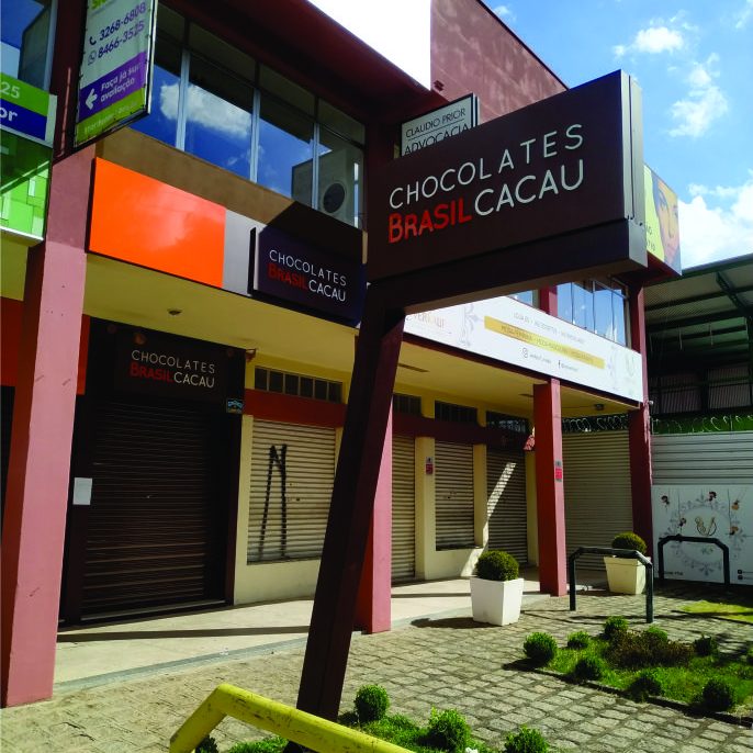 Fachada Chocolates Brasil Cacau em Curitiba Esta Comunicação visual em Curitiba foi feita com ACM e letra caixa em Acrílico. Totem em ACM e letra caixa em acrílico. Sua fachada é a porta de entrada para seu cliente.