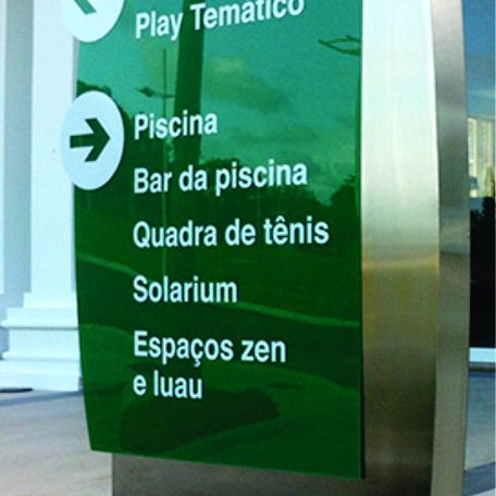 Lindo totem com estrutura em ferro galvanizado e, pintura automotiva, revestimento em chapa aço escovado legítimo. Sinalização em Chapa de ACM verde + recorte em Adesivo. Totem é na Comunica signs.