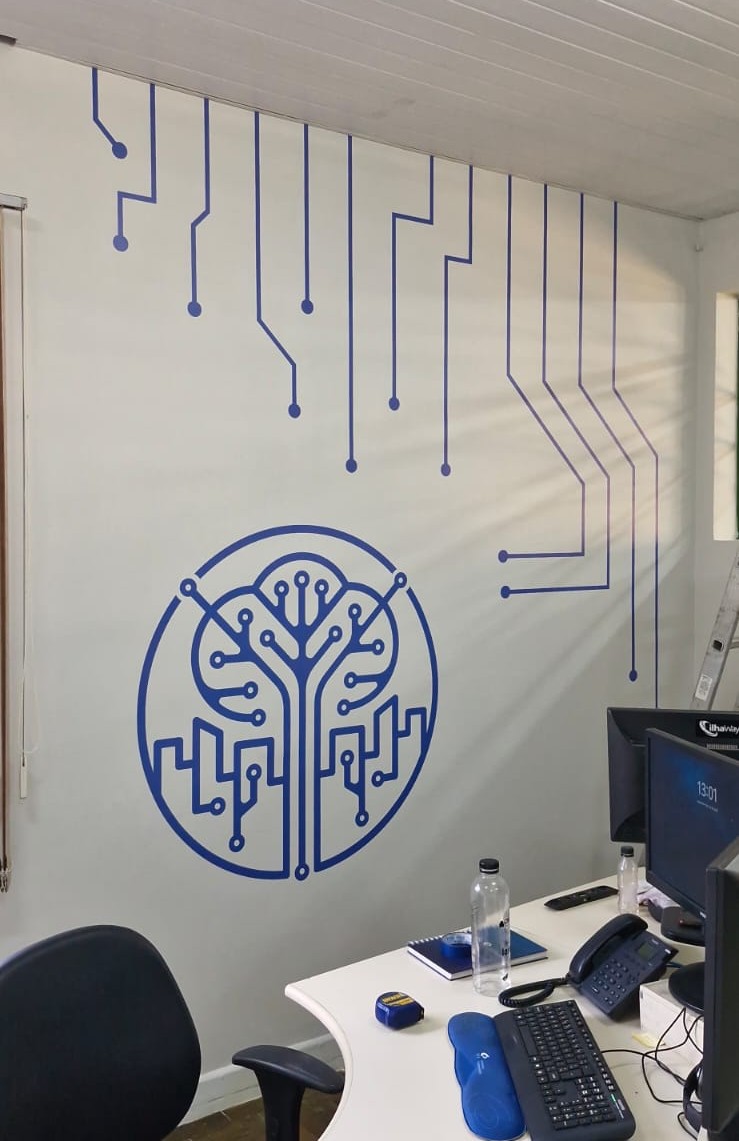 O adesivo foi produzido com tecnologia de impressão digital, garantindo cores vivas, excelente acabamento e durabilidade. O recorte eletrônico permite um design exclusivo, com detalhes precisos que valorizam ainda mais o espaço corporativo.