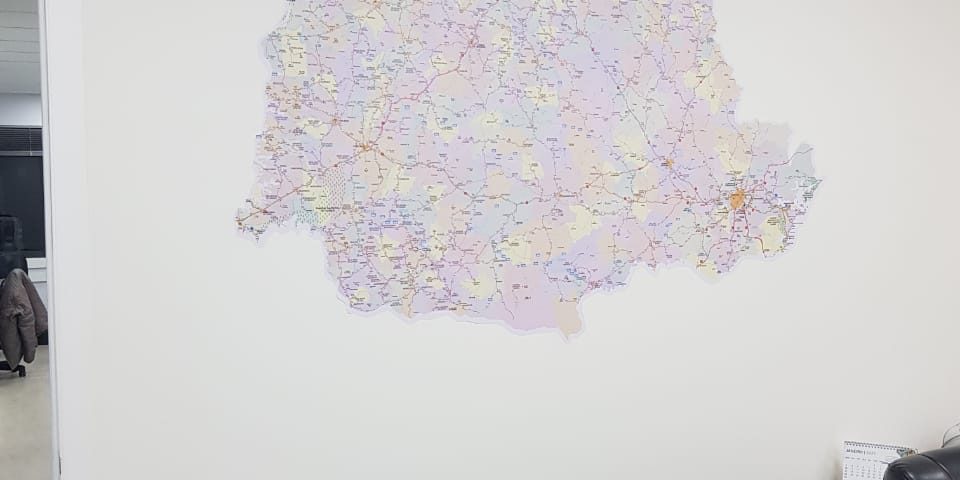 adesivo mapa personalizado, adesivo impressão digital alta resolução com recorte eletrônico, aplicação em um escritório do mapa do paraná.