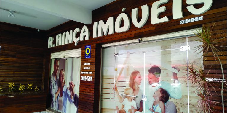 Letra Caixa em Curitiba, fachada feita com fundo deck de madeira e sinalização letra caixa alta. Porta de vidro e janelas com nossos Adesivos Perfurados, Impressão Digital alta resolução.